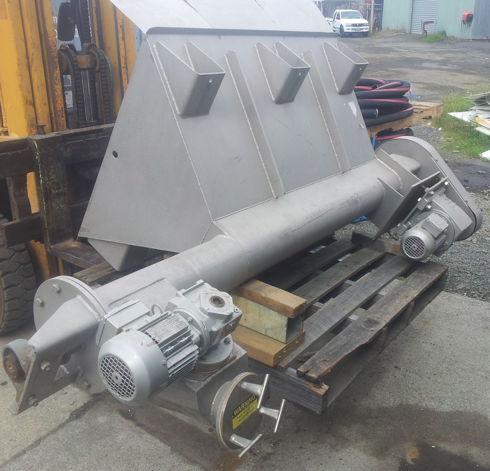 Stainless Steel hopper with full length discharge auger and right angle drive for transfer auger (transfer auger not available)
